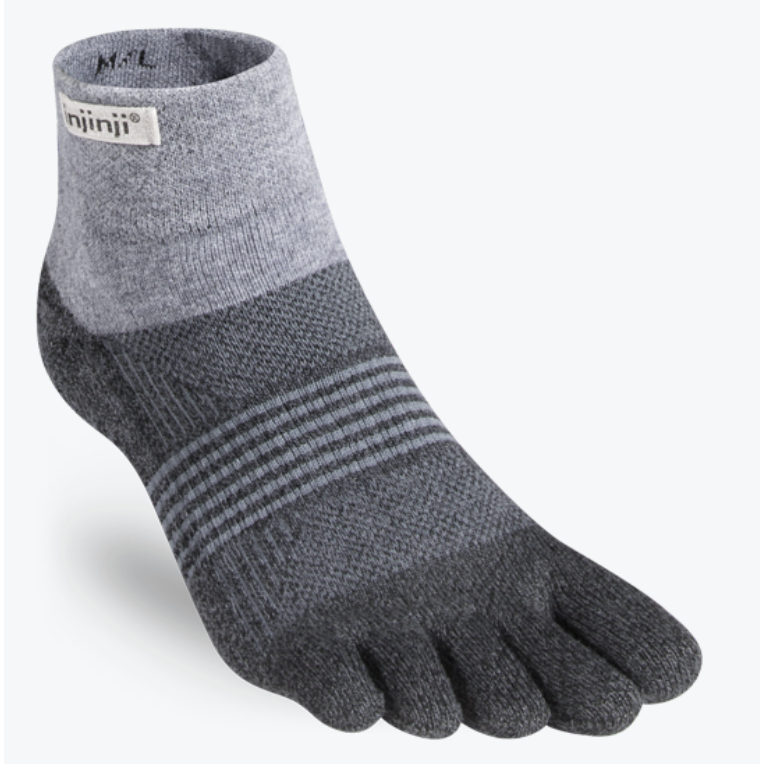 Engineered and cushioned for women who run far and hike fast on shifting, uneven trails, this midweight toesock delivers comfort and protection with agility and support. Snug, but not binding, the double-cuffed mini-crew height seals out dirt, sand, and debris. COOLMAX® wicks away moisture, nylon adds durability, and the narrower profile with increased stretch is specifically designed to fit women’s feet and toes. Arch support is built in, mesh at the top improves breathability, and Injinji's unique design wraps fabric around each toe to minimise blisters, allow a natural splay, and more effectively wick moisture. Perfect when worn with a barefoot/minimalist shoe or boot such as the Freet Mudee.